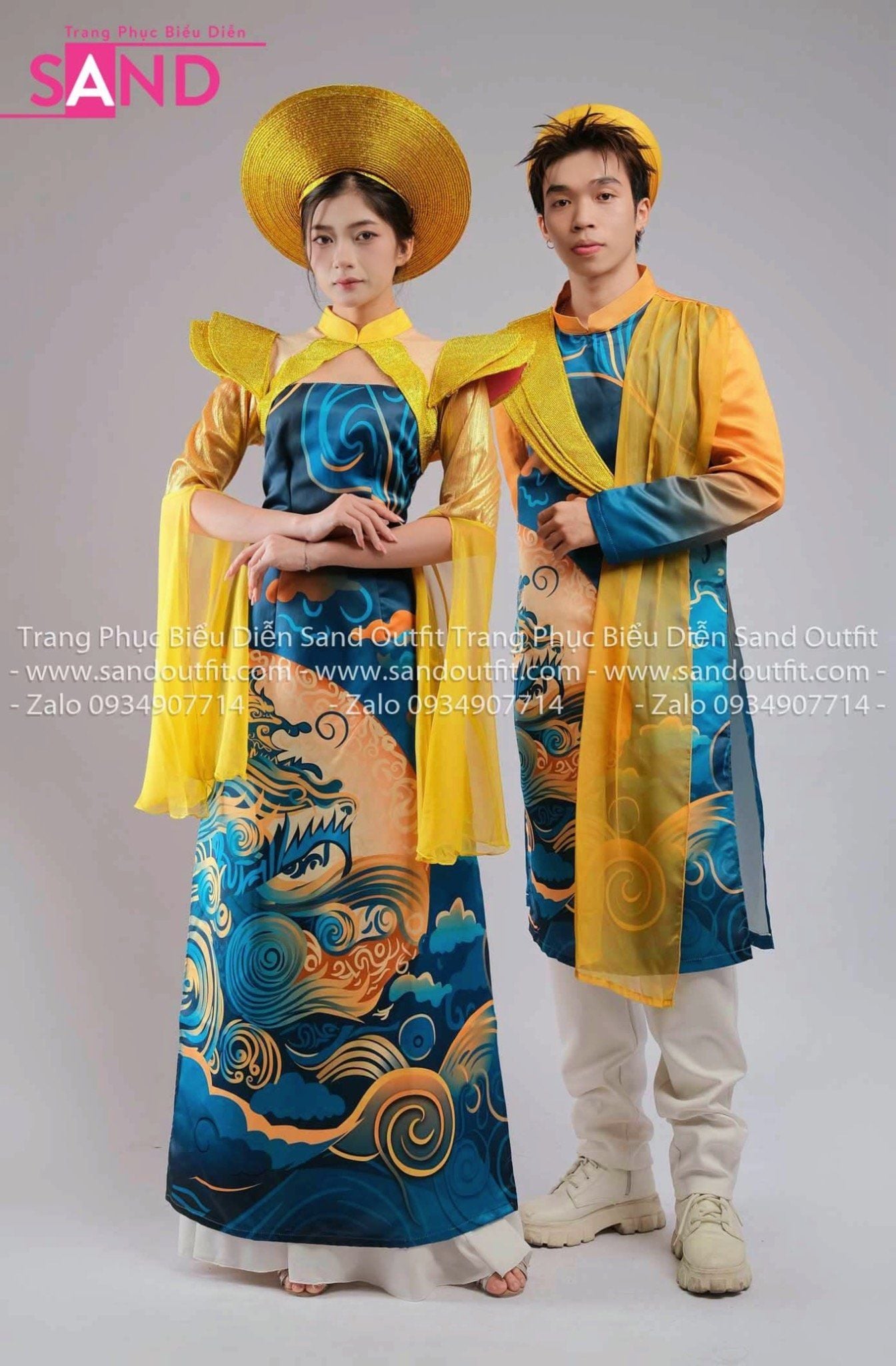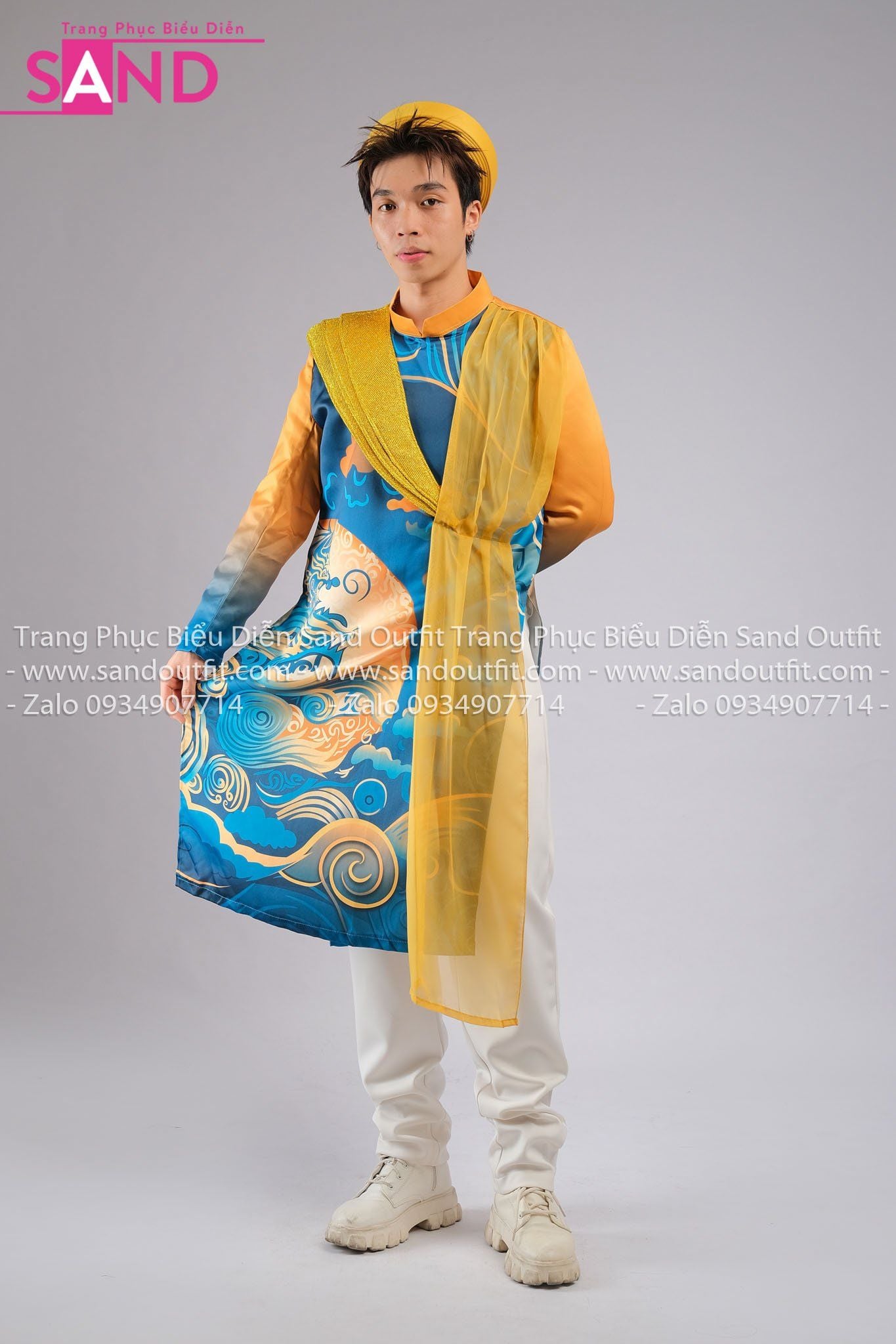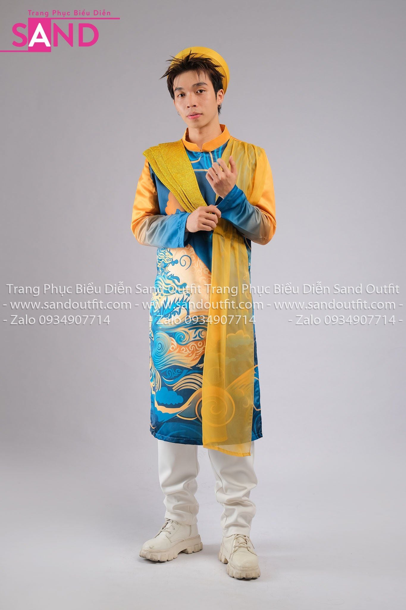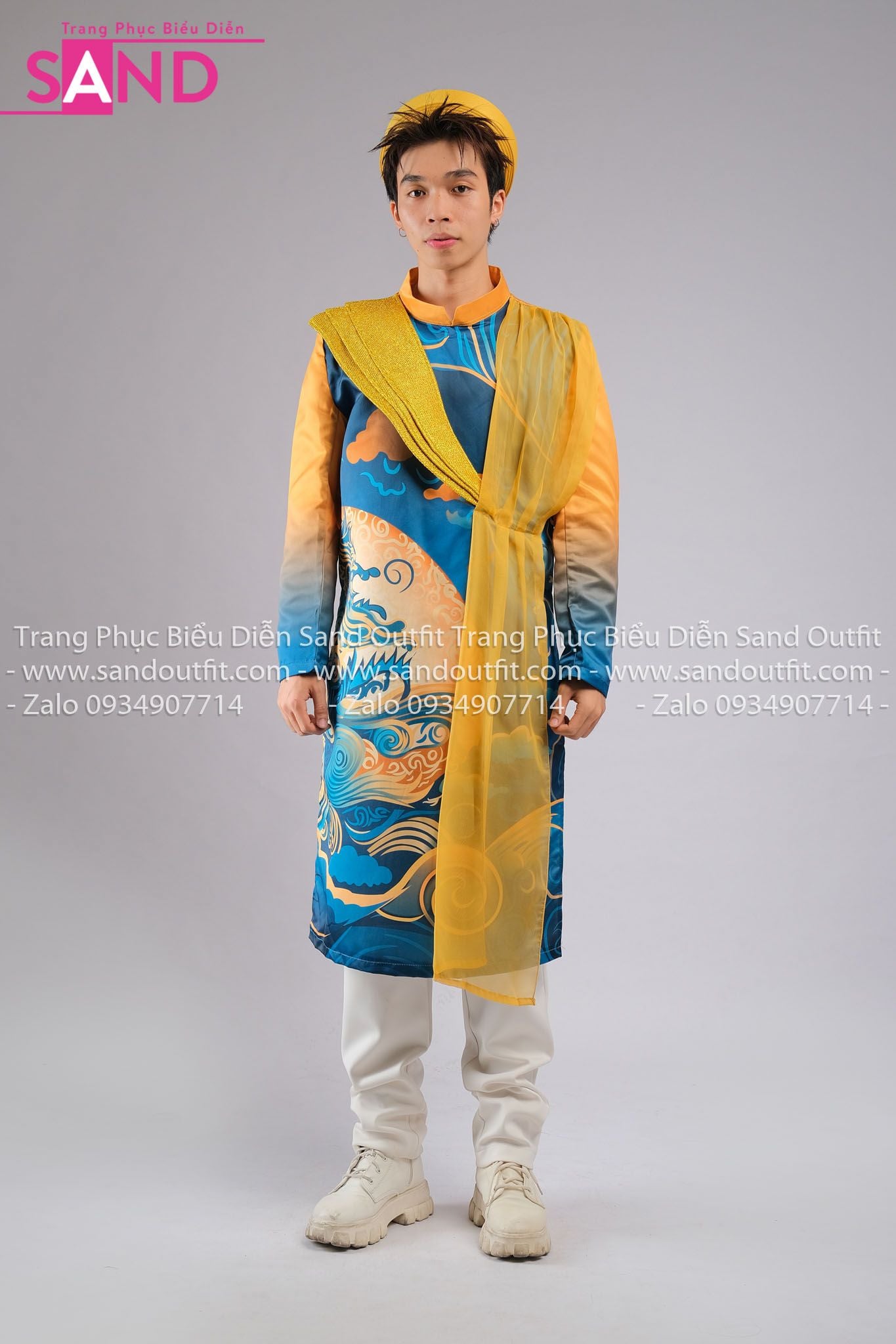 TAD0910 Áo Dài Cách Tân Họa Tiết Rồng Mây Xanh Táp Chéo Nhũ Nam - Xanh