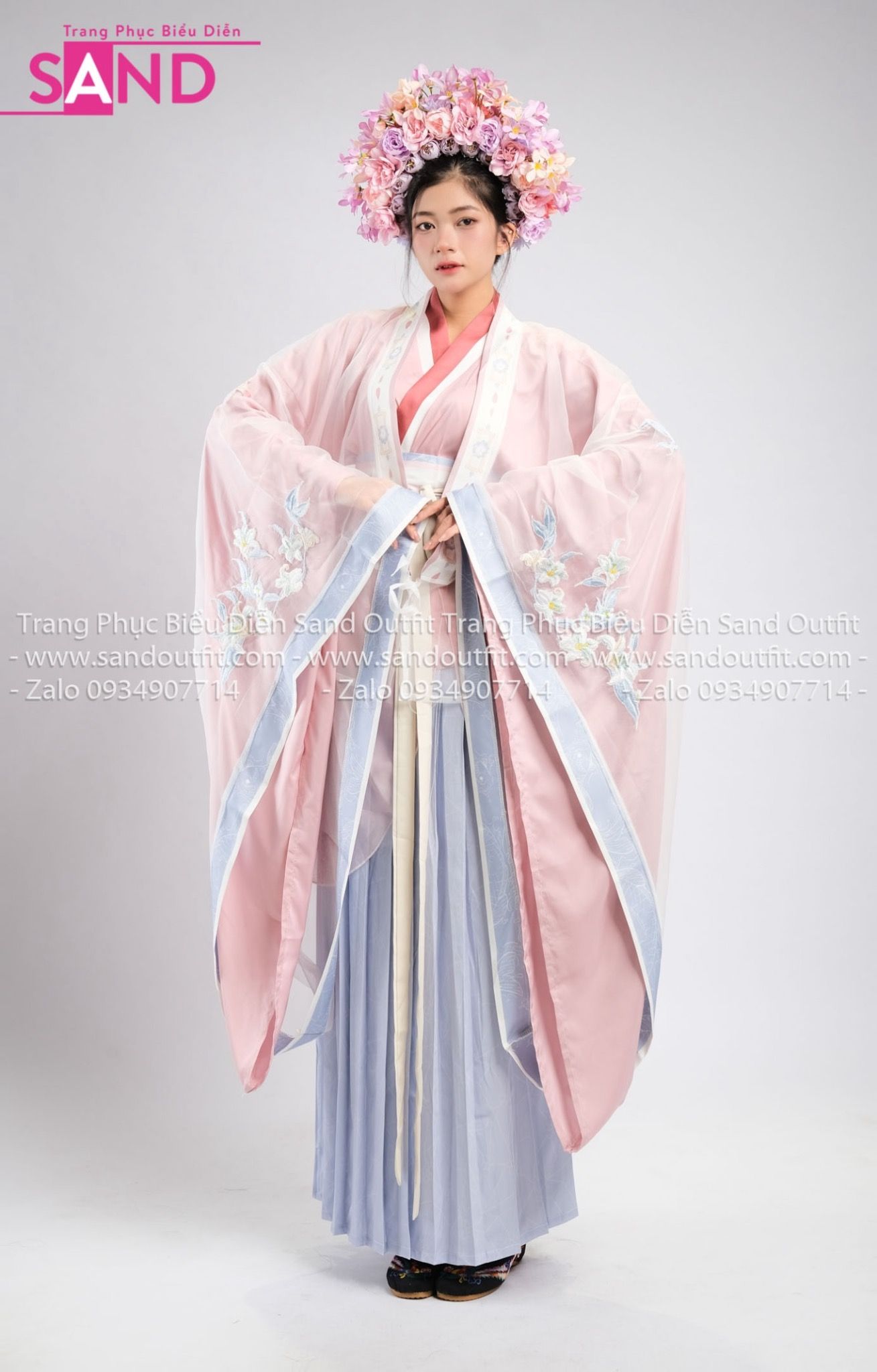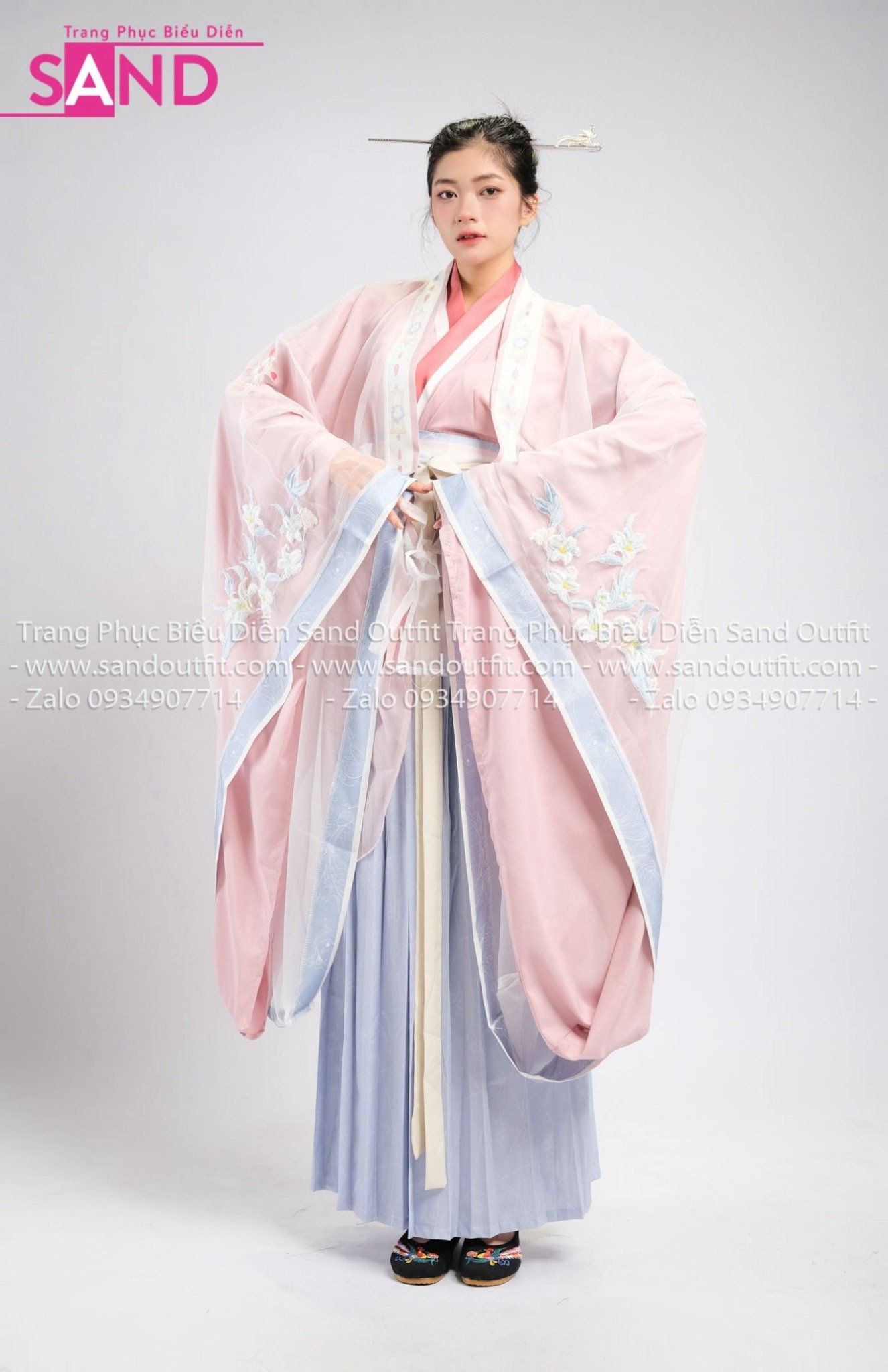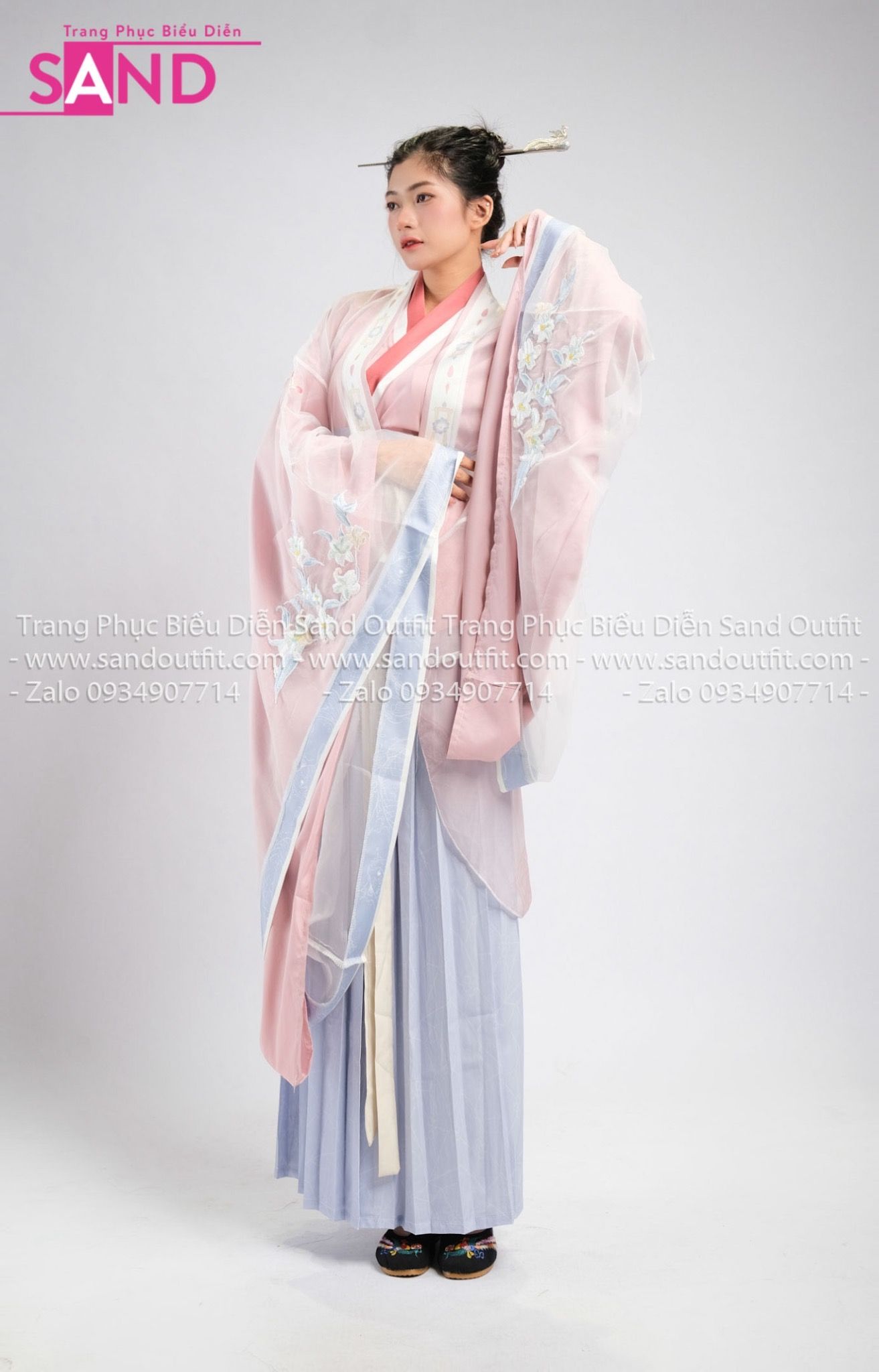 TNQ0502 Trang Phục Cổ Trang Xanh Hồng Nhạt Khoác Xanh Thêu Hoạ Tiết