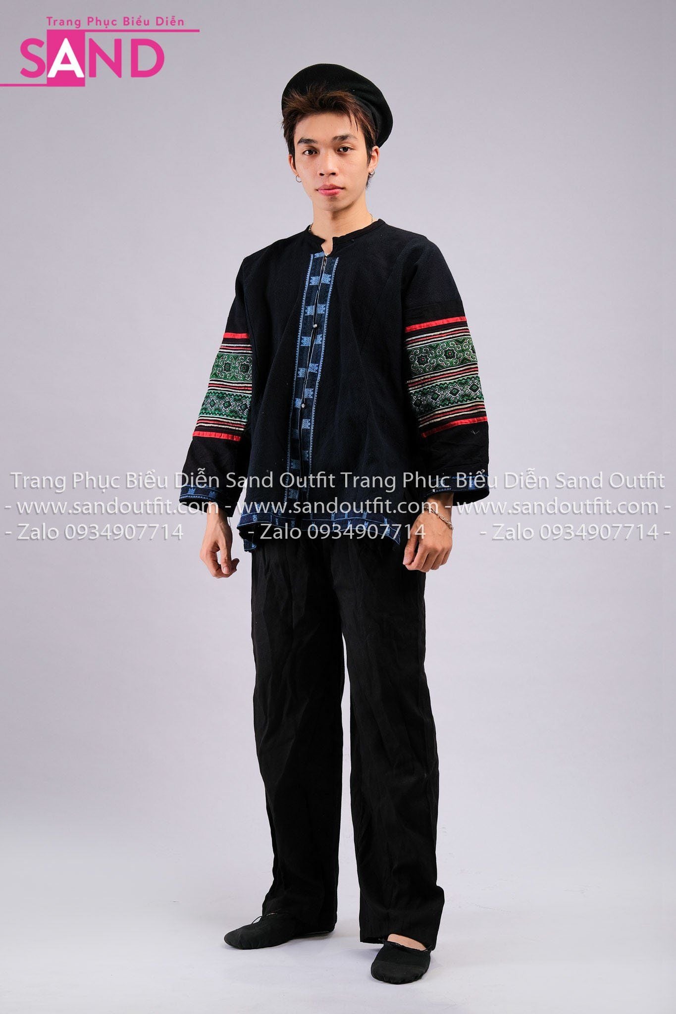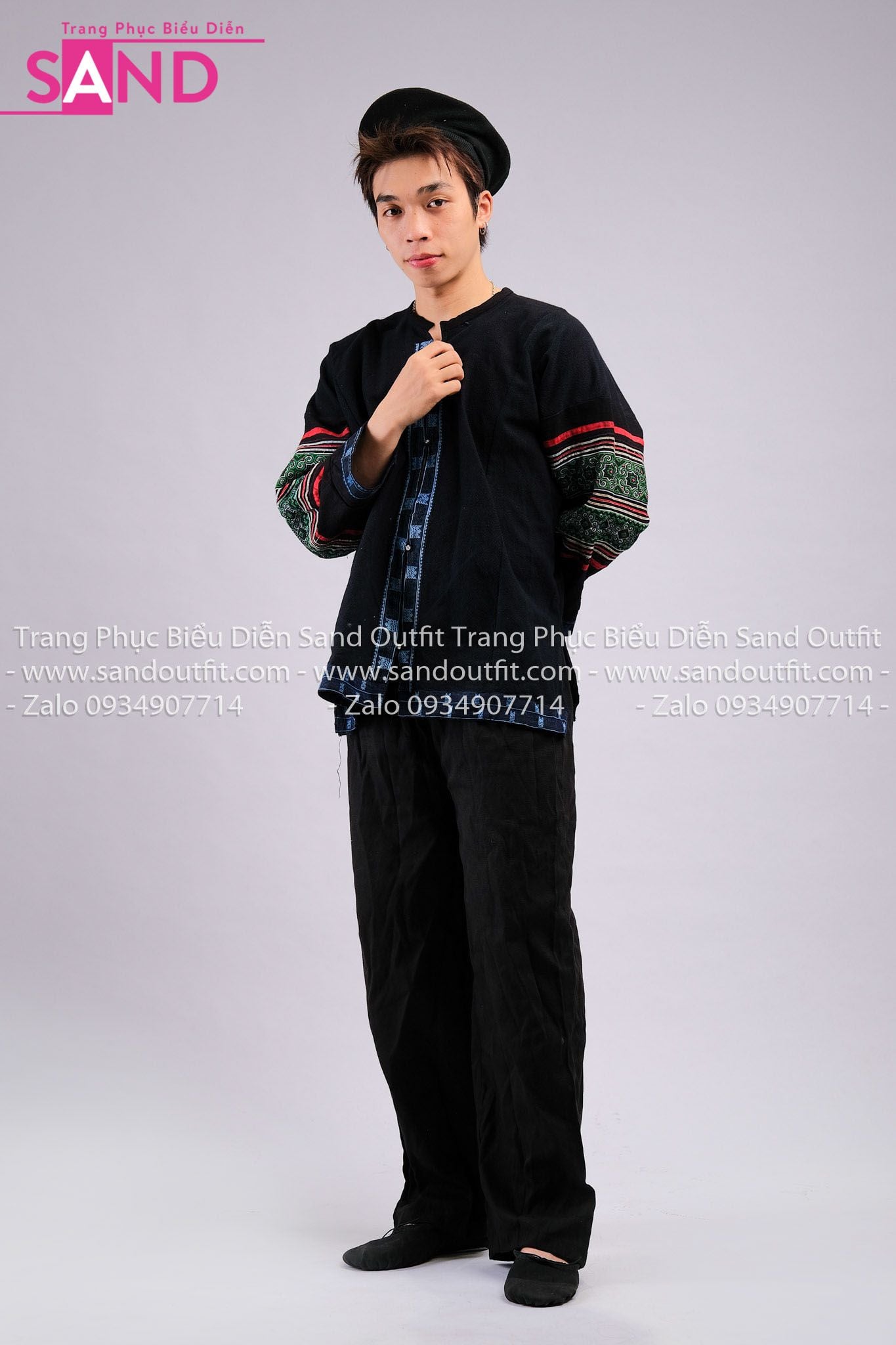 NHM0115 Trang Phục Dân Tộc H'mông Đen Hoạ Tiết Thổ Cẩm Đỏ - Nam