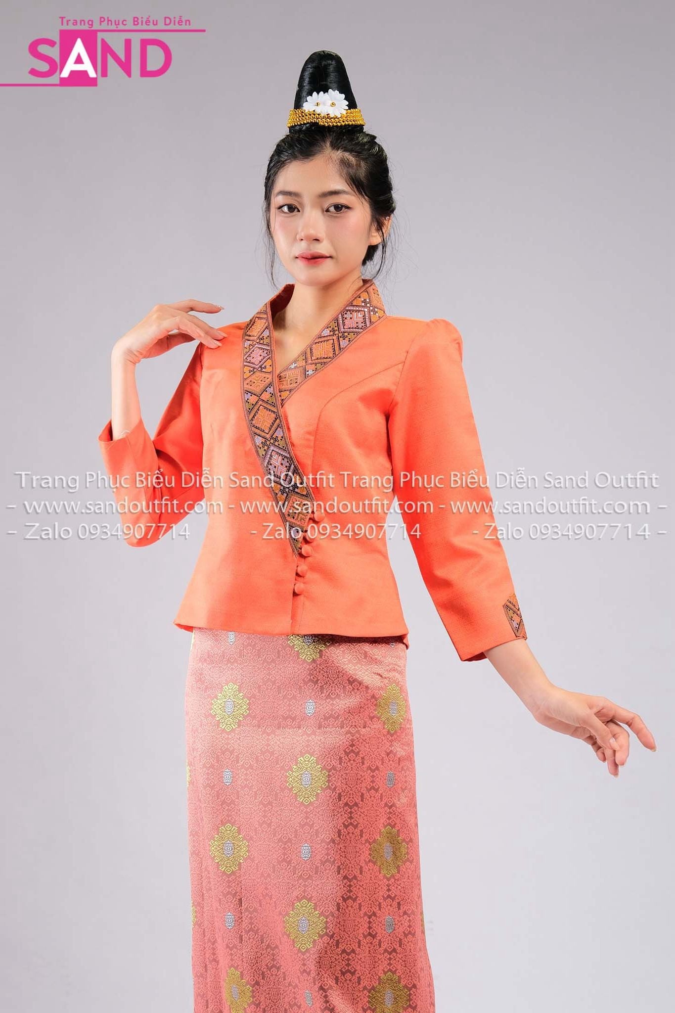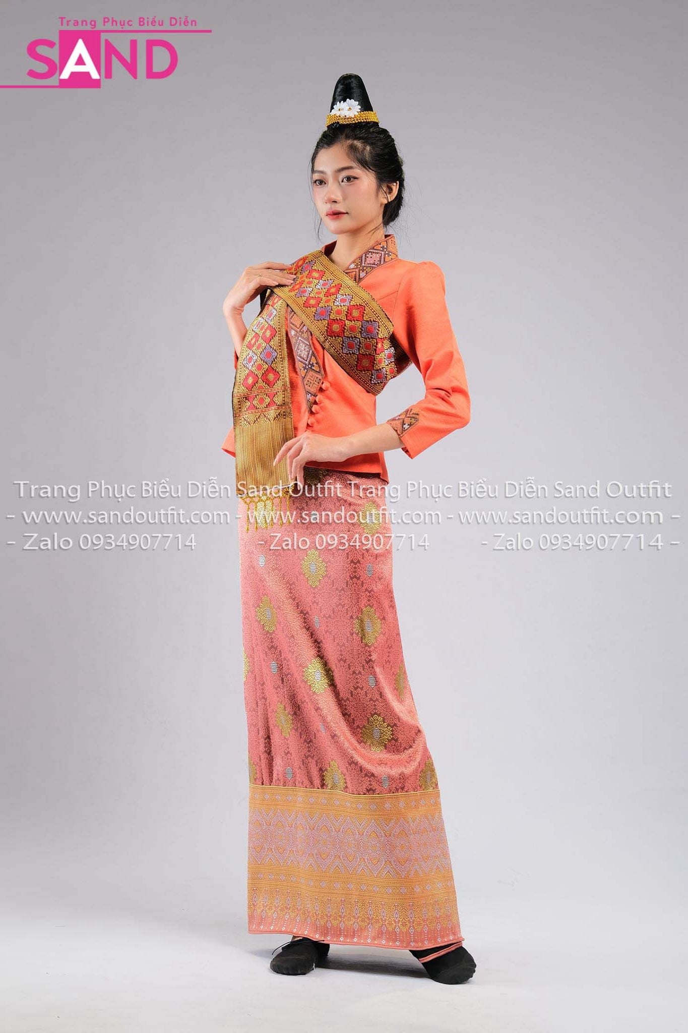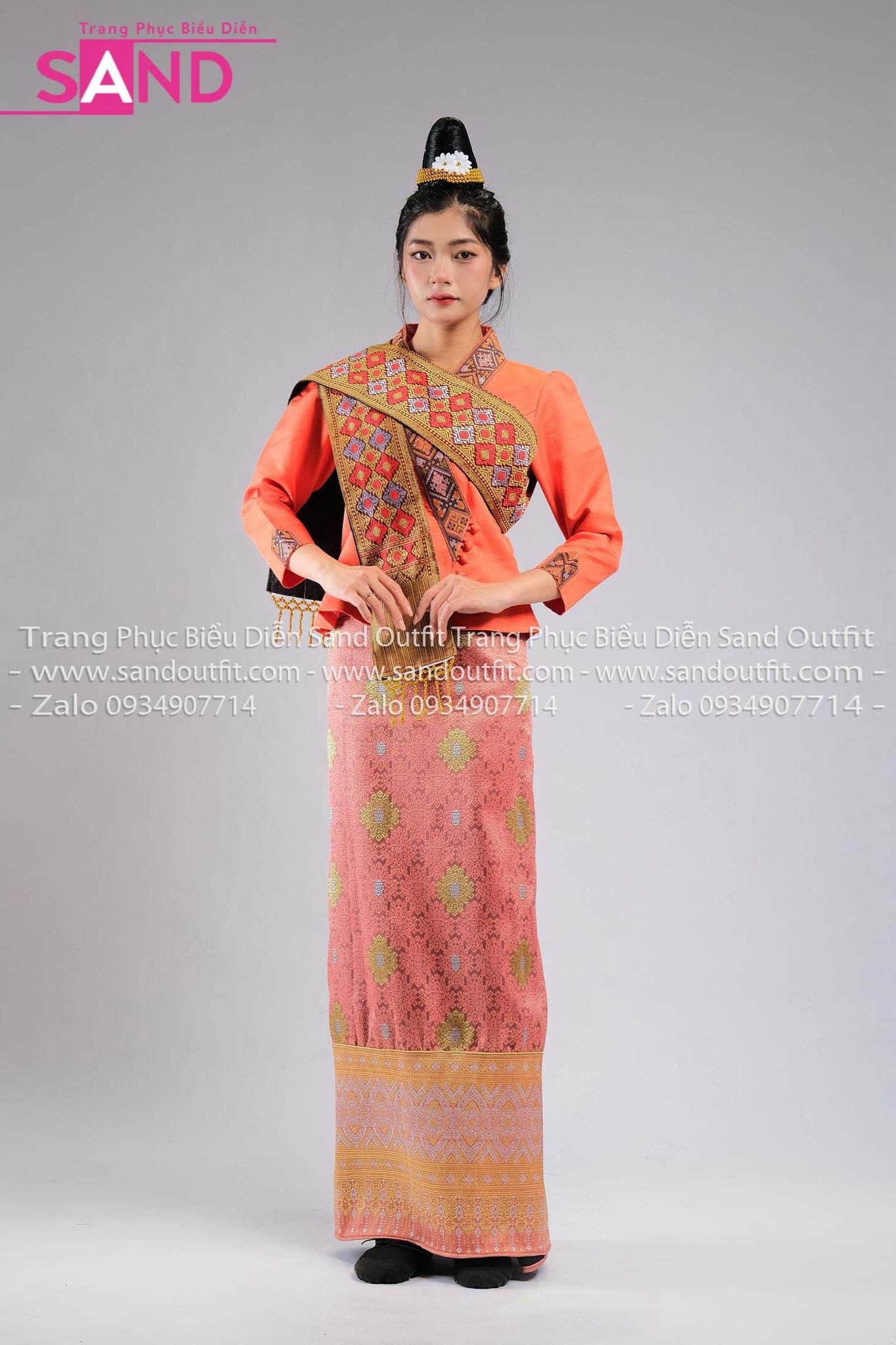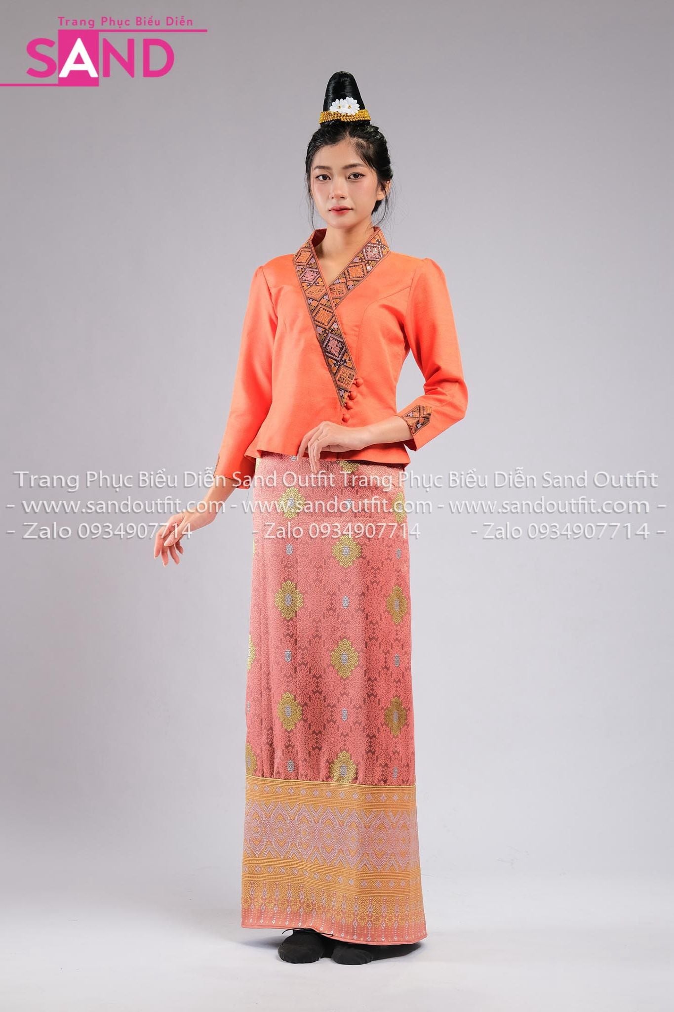 NLO0602 Trang Phục Dân Tộc Lào Màu Cam Váy Cam Sữa Nữ- Dài