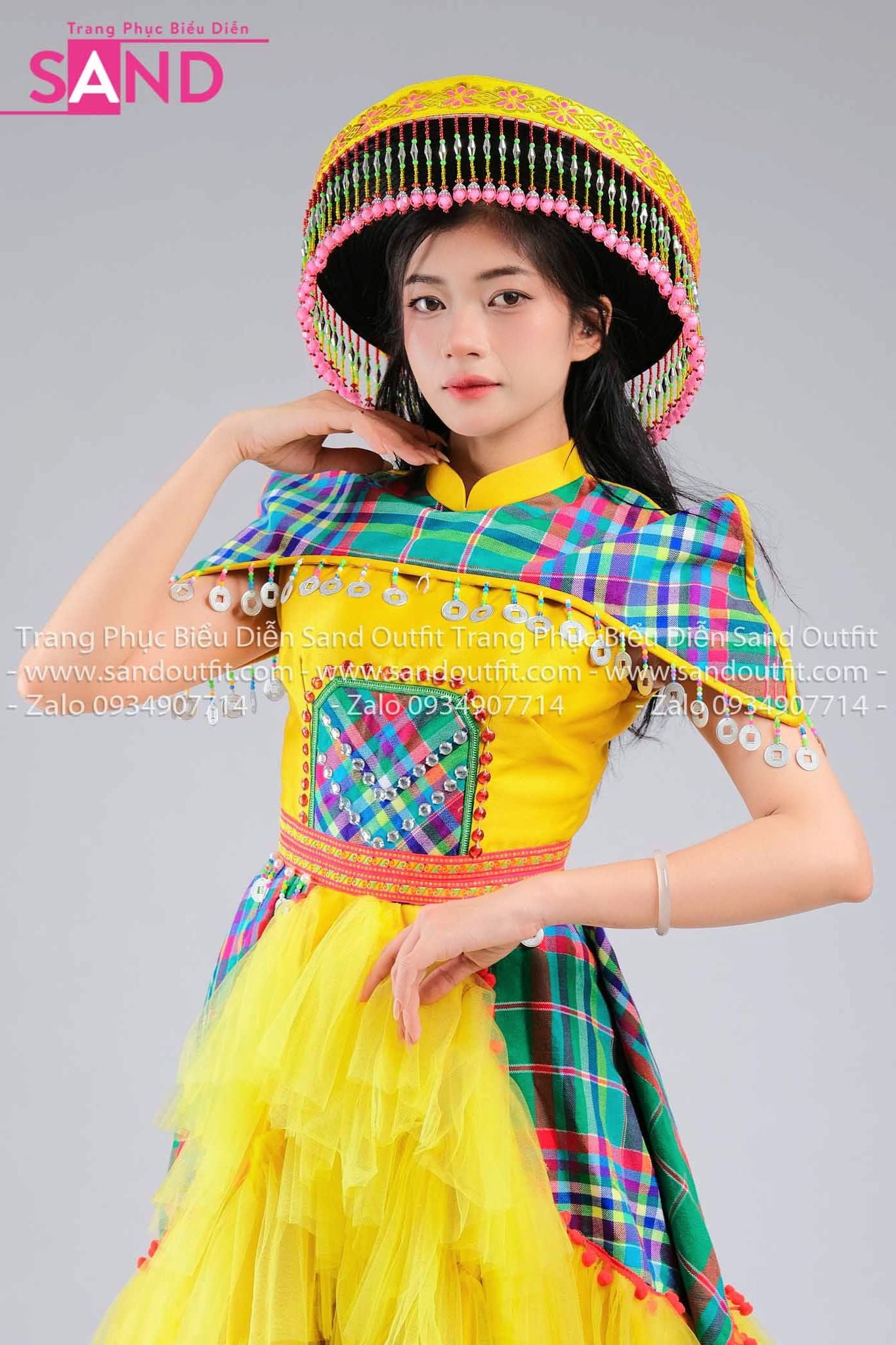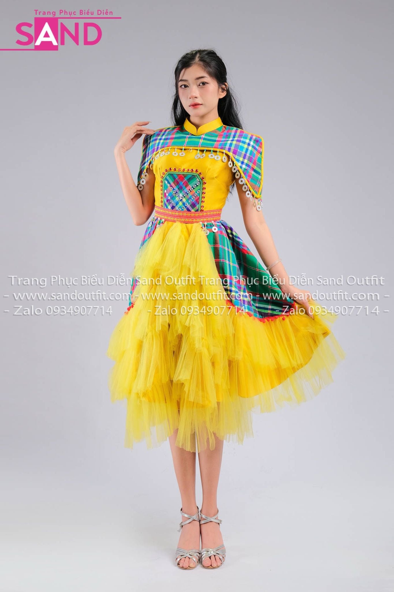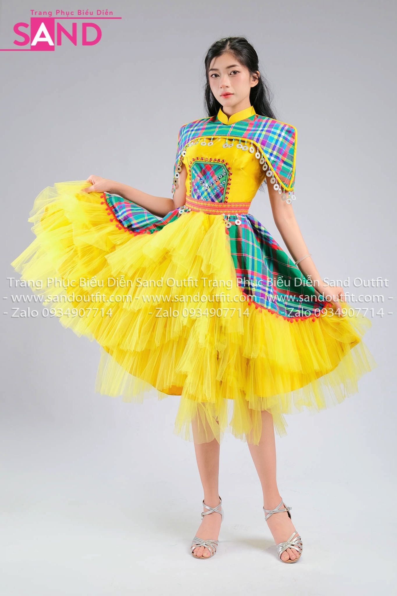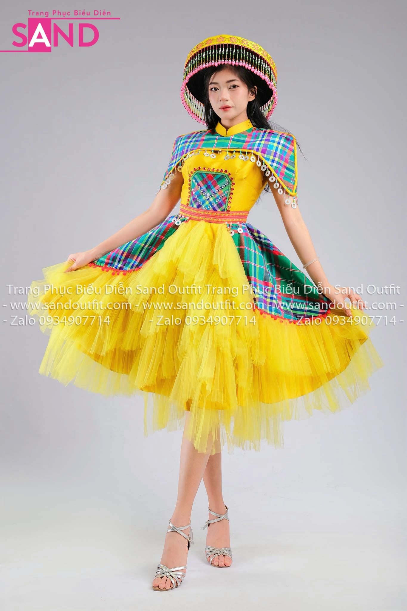 NHM0304 Trang Phục H'Mông Thiết Kế Thổ Cẩm Dáng Bồng Nữ - Vàng (kèm mấn)