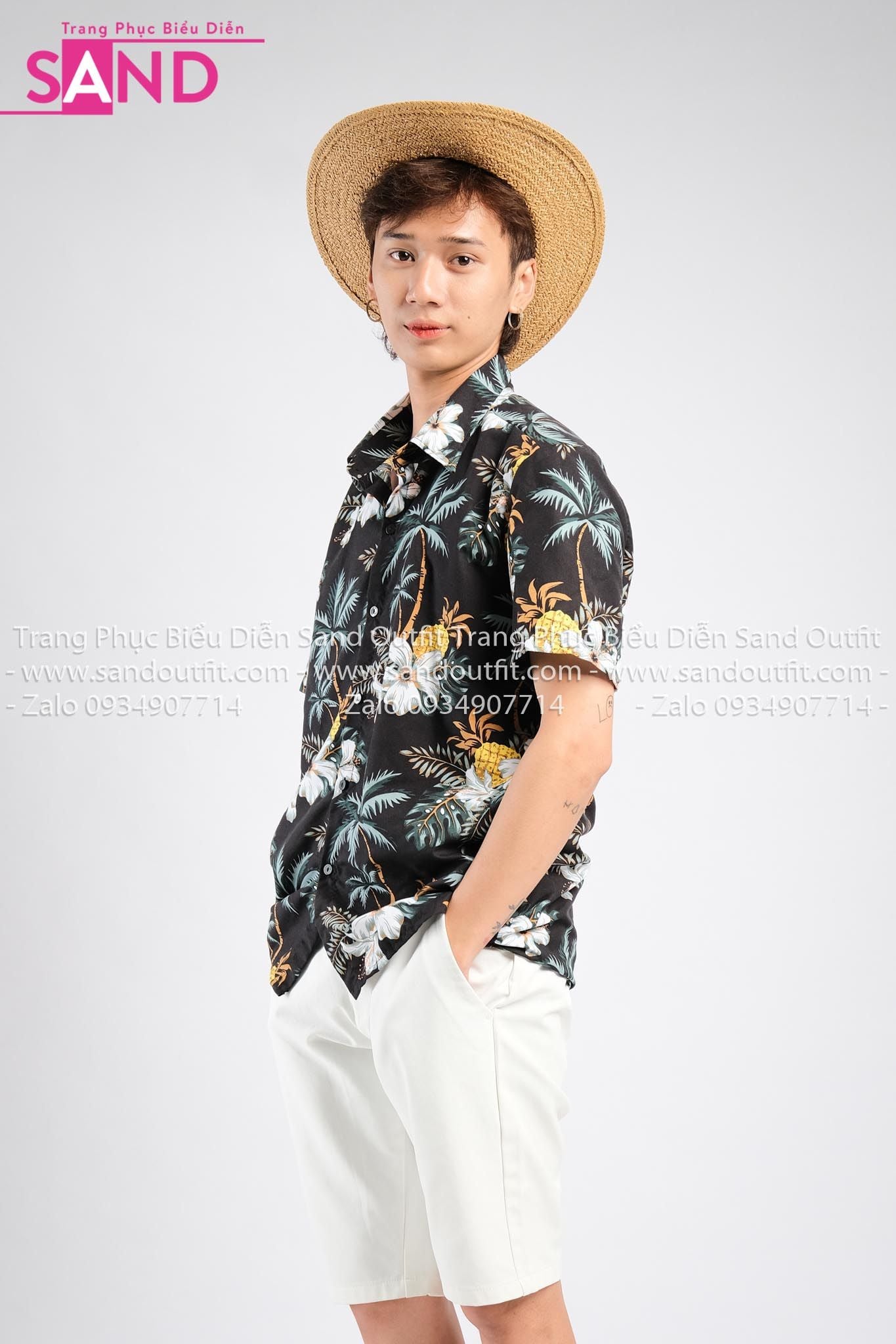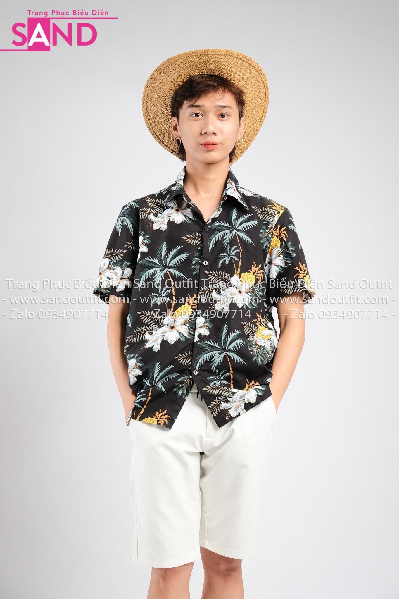 TMH0101 Trang Phục Hawai Nam Đen Hoạ Tiết Cây Dừa Và Hoa