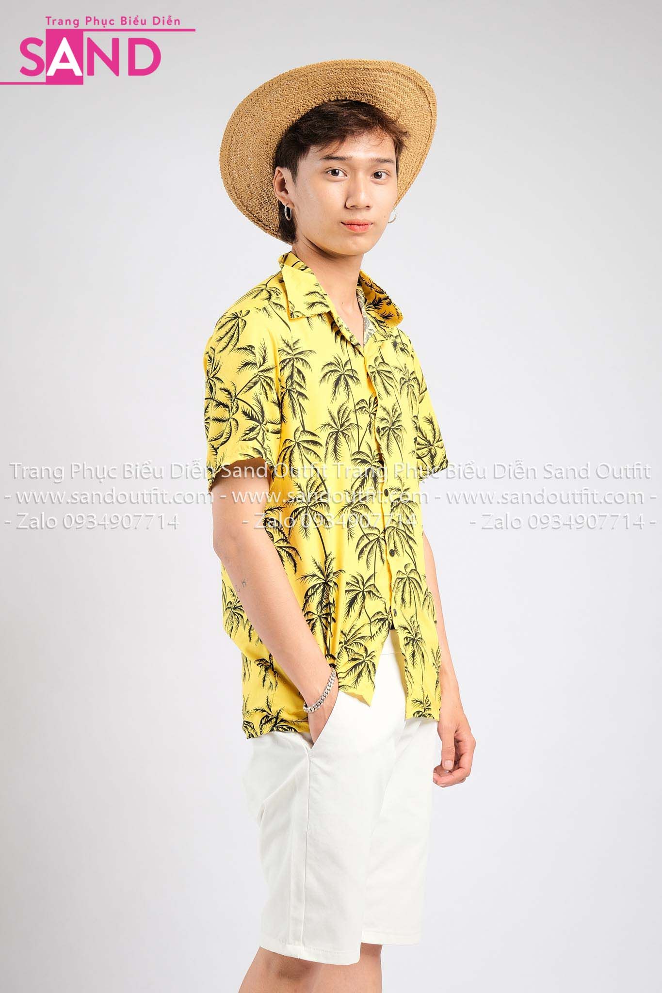 TMH0304 Trang Phục Hawai Nam Vàng Hoạ Tiết Cây Dừa